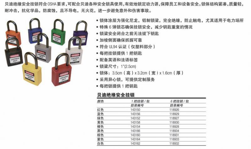 功能最強的上鎖鎖具:貝迪安全掛鎖符合所有OSHA要求,可用于安全替代上鎖過程里使用的金屬鎖具。鎖體絕緣,獨特的鎖心可防止電流從鎖梁傳至鑰匙,從而進一步提高了觸電防護性能。貝迪安全掛鎖還具有一定的防腐蝕性能。第三方檢測證明貝迪產品在重復鹽水噴霧試驗條件下的性能卓越。